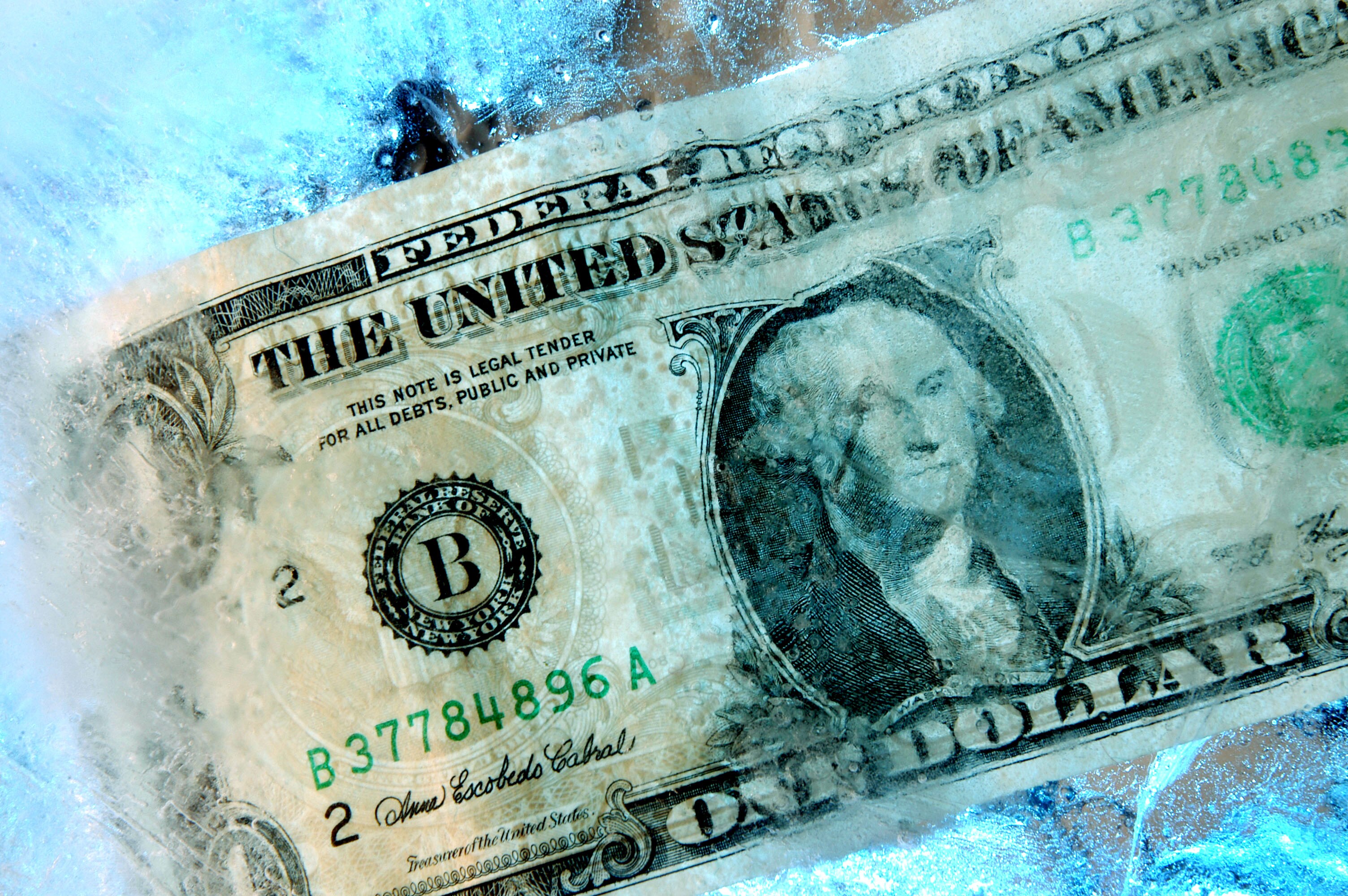 A U.S. one dollar note is frozen in a block of ice. (Photographer: Alastair Miller/Bloomberg News)