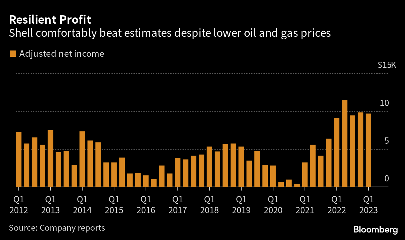 (Bloomberg) -- Shell Plc posted a record first-quarter profit and maintained the pace of share buybacks as a strong trading performance and higher liquefied natural gas volumes offset lower energy prices.