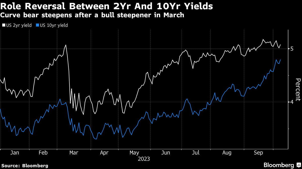 Rather than the curve steeping because short rates are falling, it's changing shape because longer yields are surging. That's largely because of the US economy's strength, reflecting the risk that the Fed will hold rates high for some time to come. The process is called a “bear steepening.”