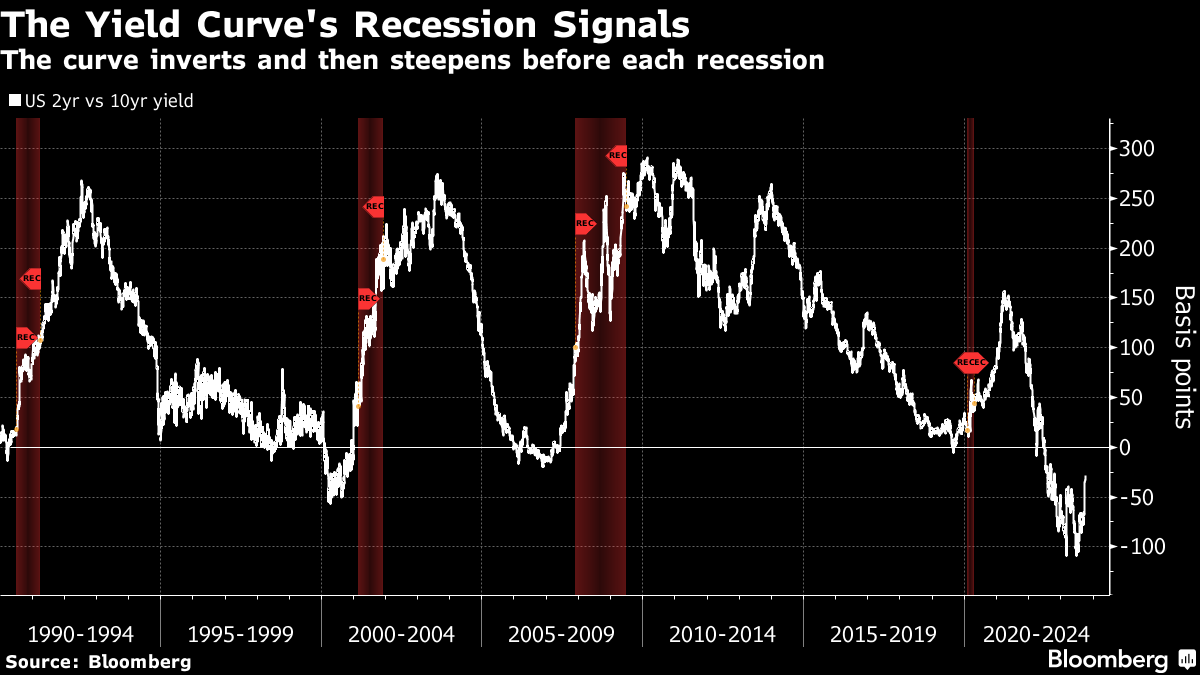 But before recessions, it flips upside down because slumps are usually accompanied by lower rates. This year, the curve had become more inverted than it had been in decades as fears of a recession mounted.