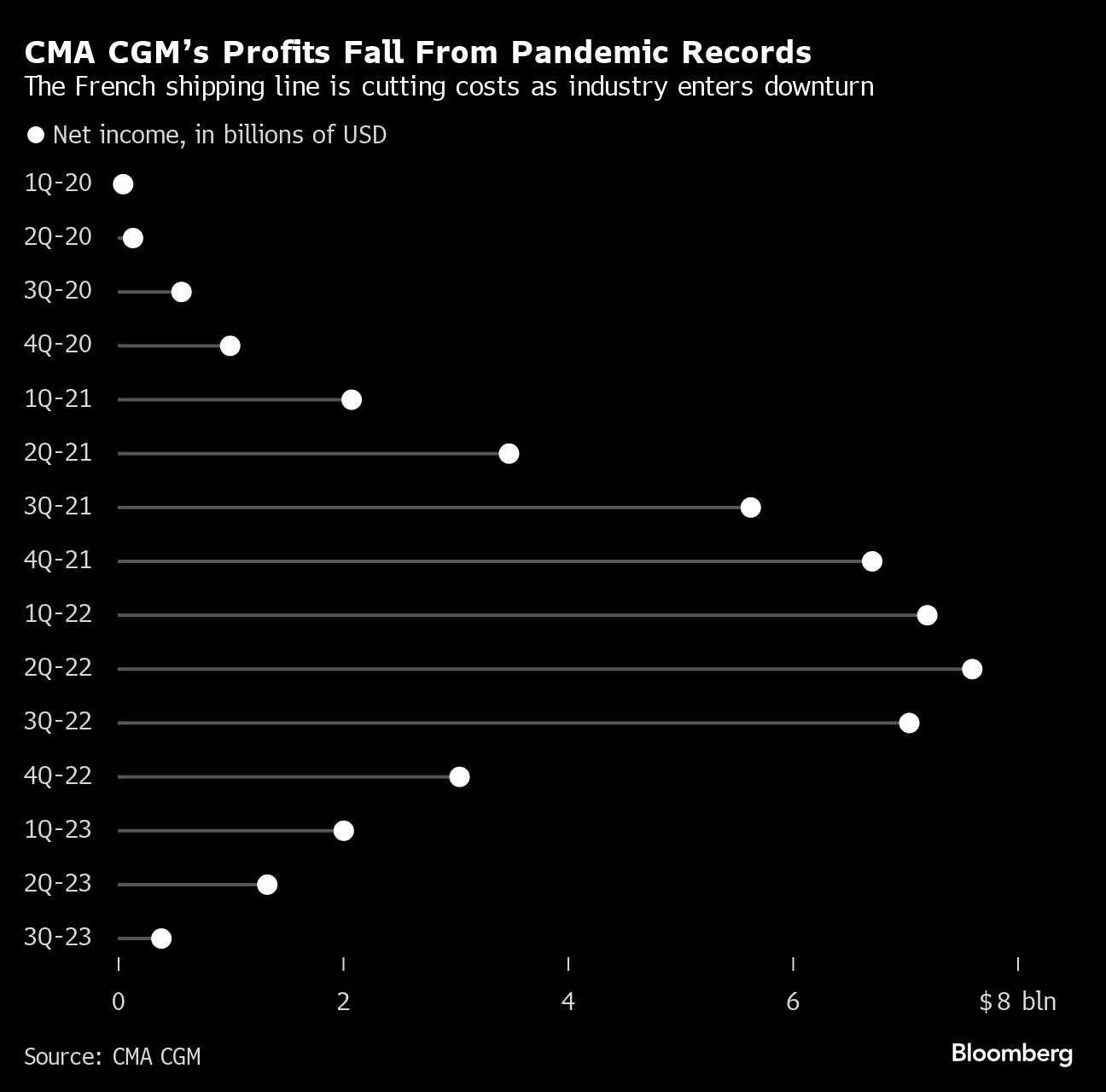 “New capacity expected on the market in 2024 will likely continue to pull down freight rates,” the French company controlled by billionaire Rodolphe Saade and his family said in an earnings statement Friday. “The slowdown in the global economy is expected to continue weighing on our industry in the period ahead.”