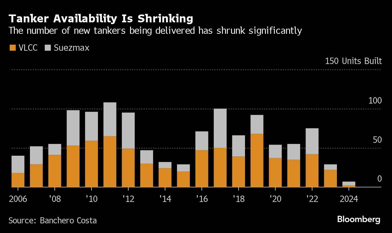 (Bloomberg) -- Longstanding warnings from the oil tanker industry that too few of the ships are being built are coming back to haunt the market after Houthi attacks on commercial shipping caused widespread diversions in global petroleum trades.