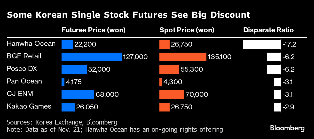 The single stock futures of BGF Retail Co. and Posco DX Co. expiring December traded at least 10% cheaper to their spot prices earlier this month before paring losses to 6% as of Nov. 21, exchange data show. Before the prohibition on short selling, only one company — Hanwha Ocean Co. — saw a heavy discount amid an ongoing rights offering.
