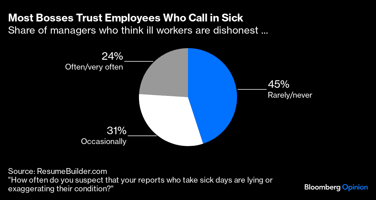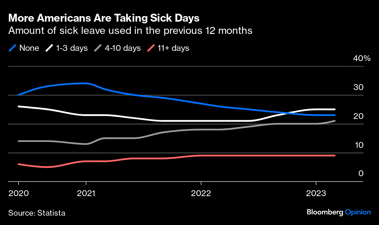 That might be how the current moment feels in some offices, but the data suggest most are more humane. In fact, more employees are taking sick days than before the Covid pandemic — and most managers support them. That's ought to be reassuring news for anyone who gets sick. Which is, after all, all of us.