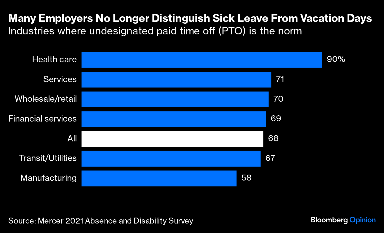 (Bloomberg Opinion) -- It's become the conventional wisdom: Sick days haven't been the same since the Covid pandemic “raised the bar” for taking time off. Mass layoffs and strict return-to-office policies have left ailing employees feeling “sick shamed” by attendance-taking bosses. Have a sniffle? Tough it out — or at least work from home.