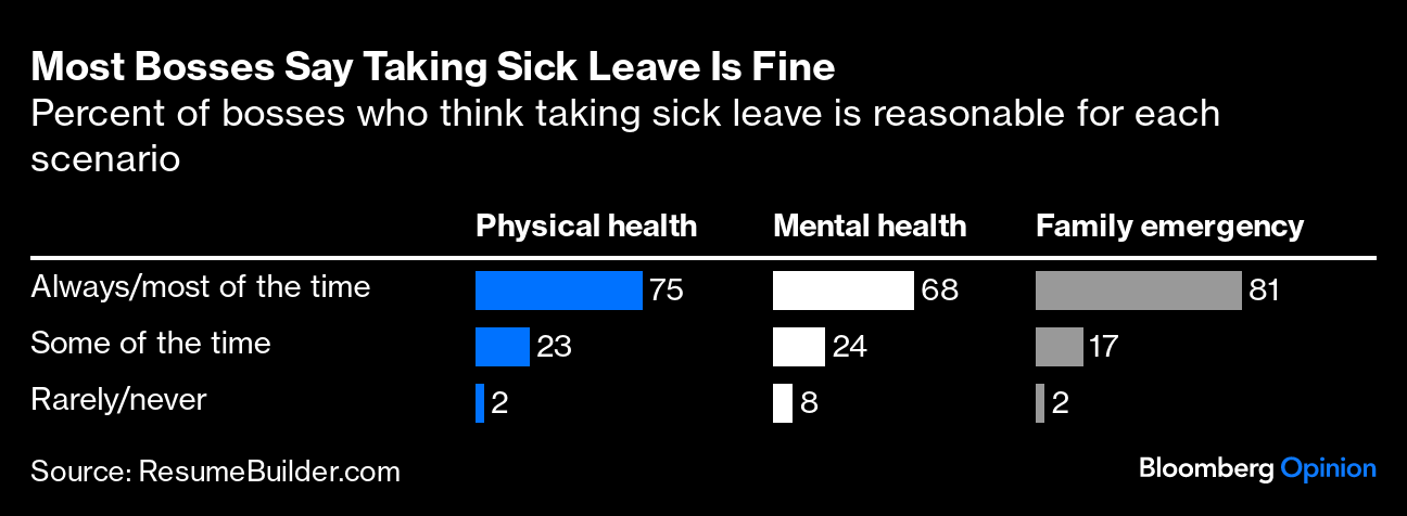 Employers should reassure nervous workers that sick leave exists to be used. In a January survey by Resume Builder, most bosses agreed that it's reasonable “always” or “most of the time” to take sick days for physical mental health — and a huge share said it was even OK to use sick leave for unspecified family emergencies. Wouldn't it be nice if more workers knew that?