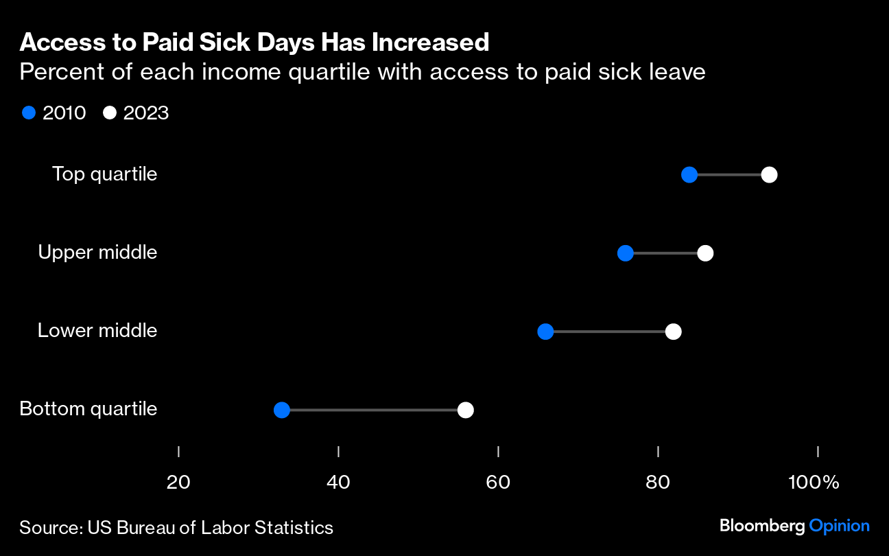 Second, more workers across the income spectrum now have paid sick leave, although access is still unequal. It doesn't surprise me that as access to sick leave has expanded, more people are using it.
