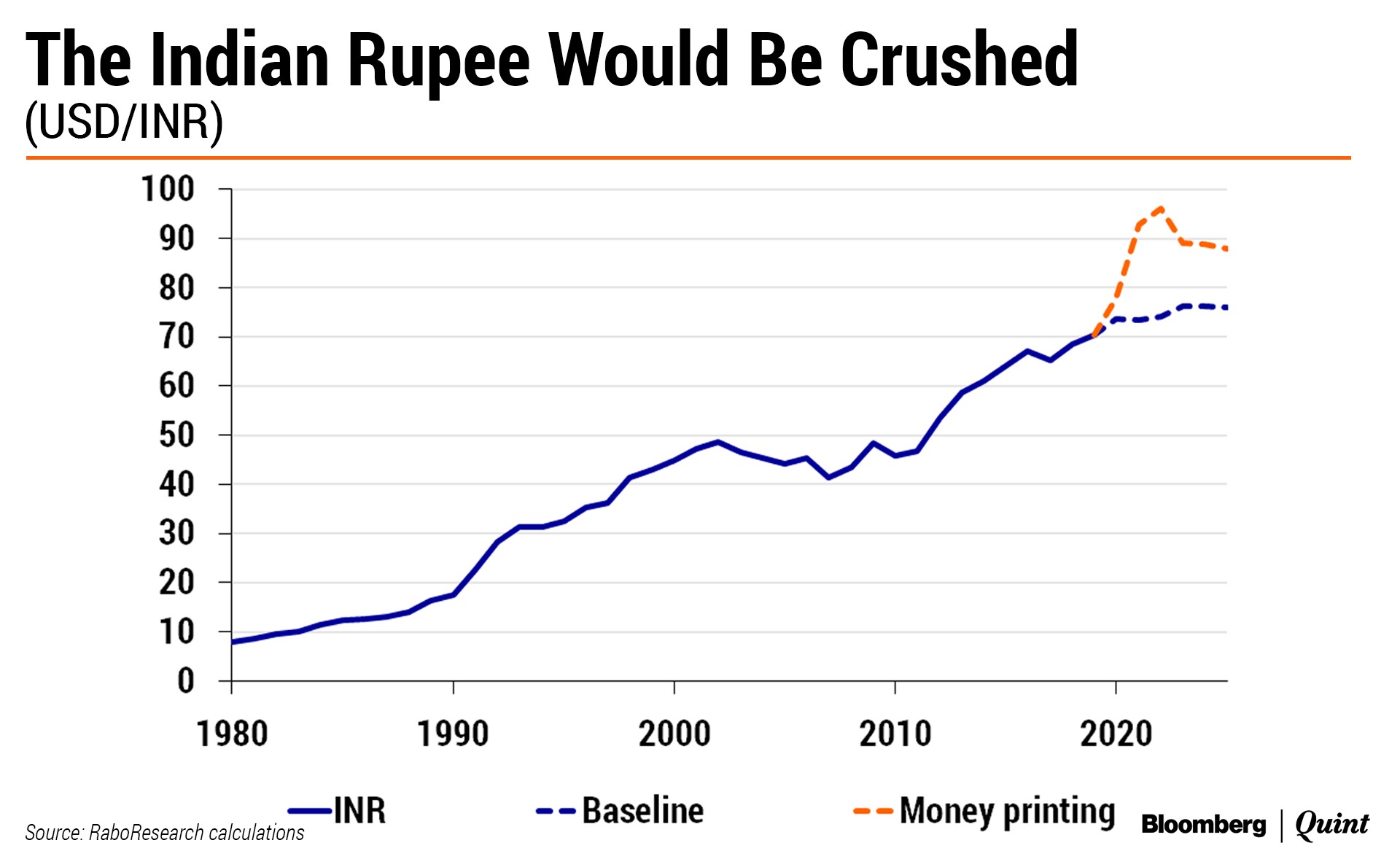 We have drawn up a scenario to gauge the economic impact of another government stimulus package financed by freshly printed rupees, starting from June-September 2020 onward and spread out over multiple years. We assume a package similar in magnitude to the $270 billion stimulus package announced in May this year, which is equal to 10% of GDP. The major difference is that we assume that this second package is fully financed by freshly printed rupees.