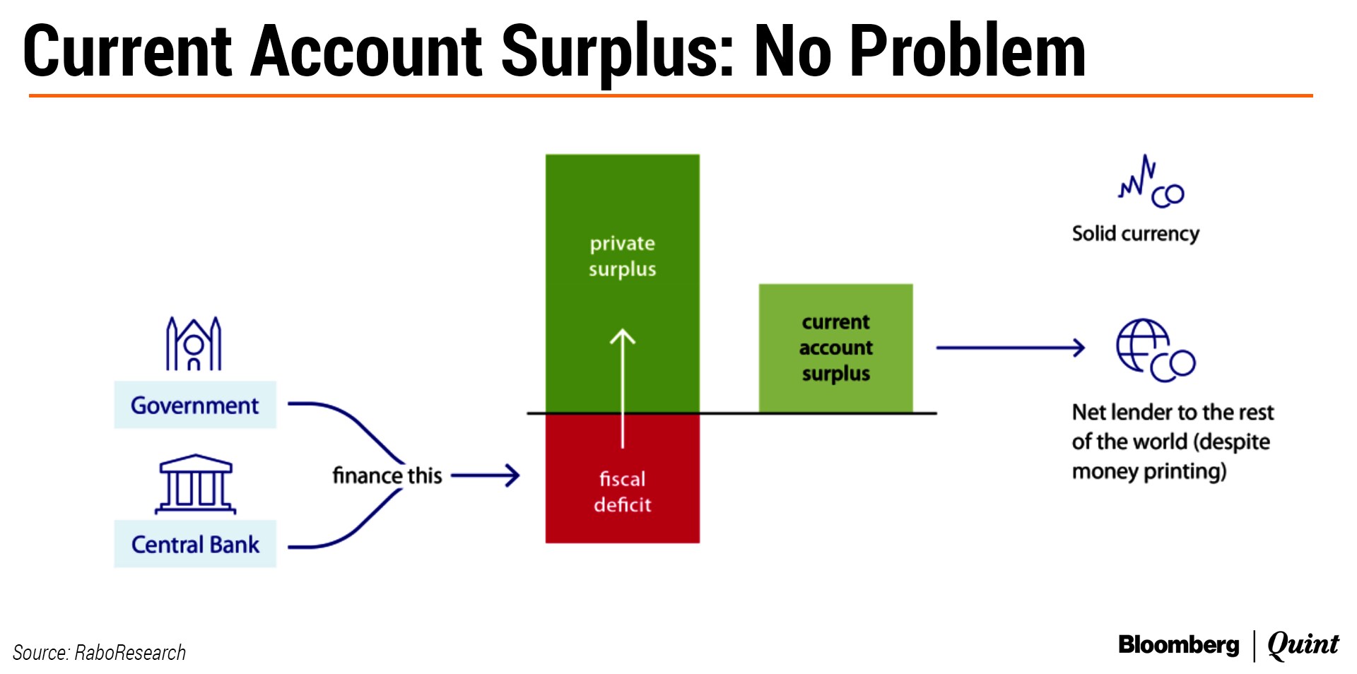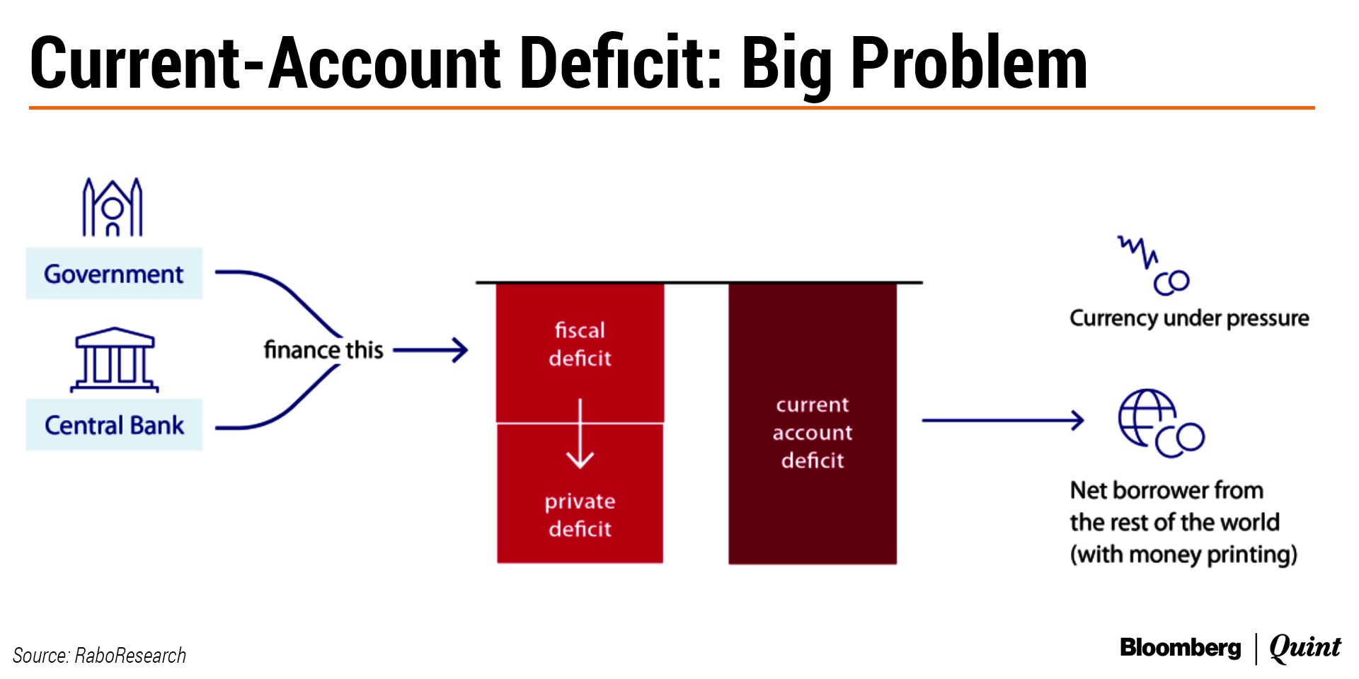 But if a country runs a structural current account deficit—as India is doing and seeing past the April-June lockdown anomaly of a small surplus, things become problematic. Why? Because the government is spending - with printed money – while households and businesses, collectively, are dis-saving too.