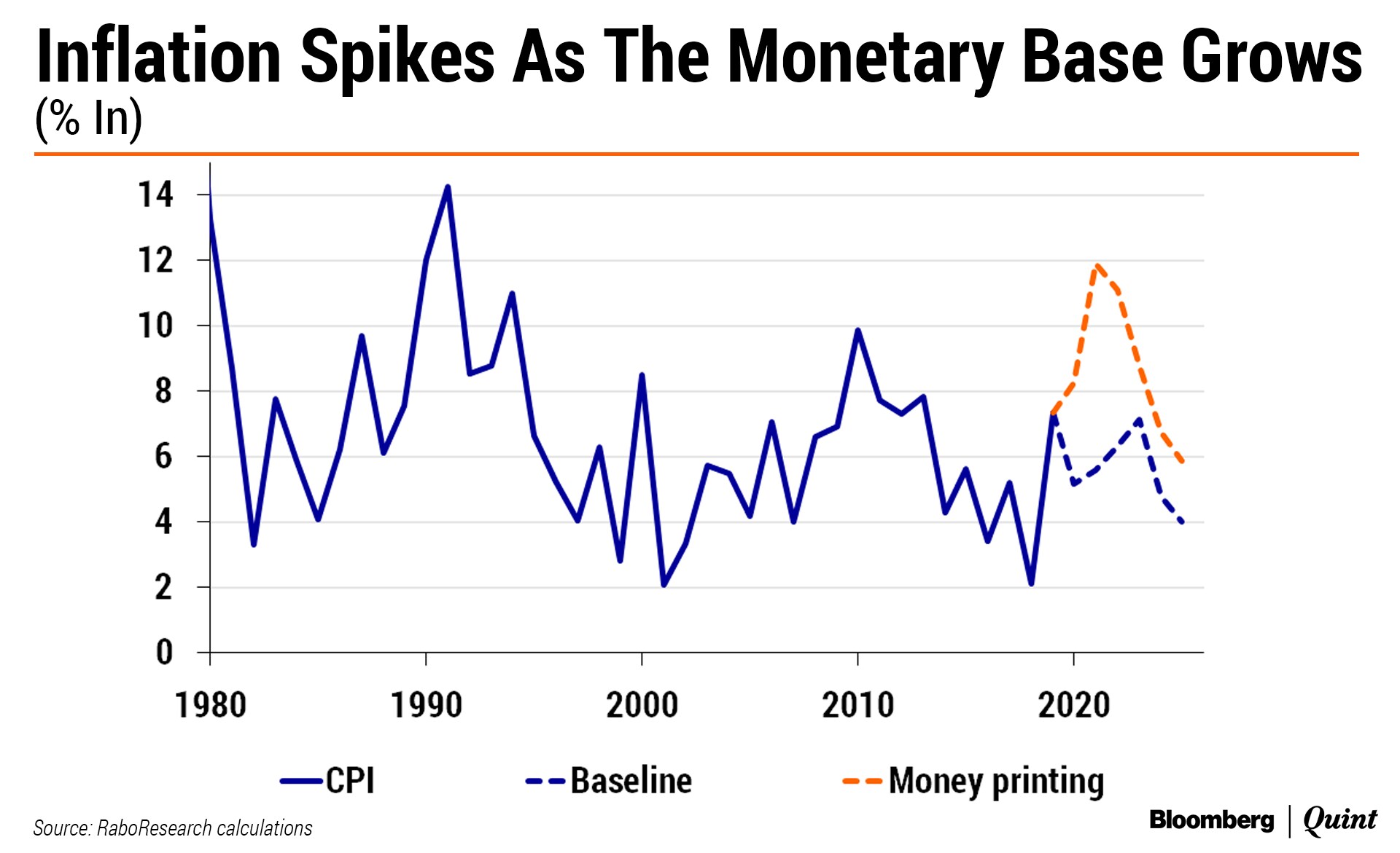 In the short term, debt monetisation in India would not have too many negative repercussions because of massive risk-off sentiment, a point which has been raised by former RBI governor Raghuram Rajan. Banks are still reluctant to lend, as they prefer to park excess liquidity at the central bank against the reverse repo of 3.35% instead of receiving a yield of approximately 6% on corporate lending or government bonds. So even if the RBI started buying bonds on the primary market and this cash was spent in the real economy, it would ultimately end up on deposits by banks, which would channel those excess funds again to the RBI. In a low-interest-rate environment, nobody believes inflation could be a problem. In fact, we wouldn't be surprised if most young traders have never witnessed a high inflation regime to begin with and, therefore, do not keep an eye on that old-fashioned relic from the past: CPI.