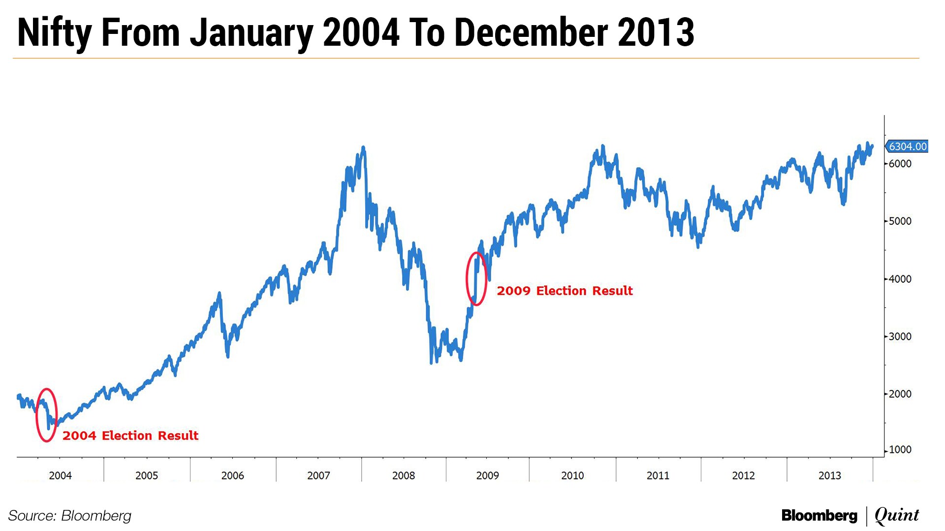 This holds true for politics too. If your investment horizon is, say, the month of May 2019, a single event is going to matter for your performance. If your horizon is January 2019 to January 2029, you can afford to totally ignore what happens in May 2019. The chart below shows the Nifty performance from Jan 2004 to December 2013. The period has two general election result days and on both those days, the market was locked on a double-circuit breaker.