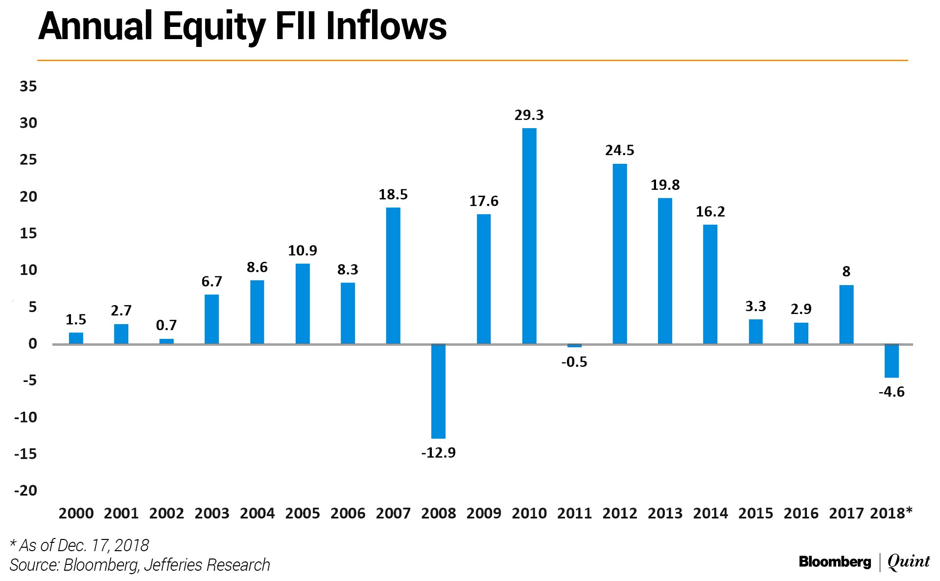 There is a difference when you are investing for yourself and investing for others. When you are investing for others you can be forced into doing things which you don't agree with as an investor because that's how typically fund inflows and outflows happen. In mid-2017, we were writing about the fact that the macro improvement that India saw from 2014 was reversing and market valuations were not factoring it in. However, money kept flowing in all through 2017. Foreign institutional investors net bought $8 billion of Indian equities in 2017. On the other side, during the panic months of September and October 2018 money was leaving the country. With net outflow of $4.6 billion as of Dec. 17, the year is on track to be the worst year for FII flows, barring 2008.
