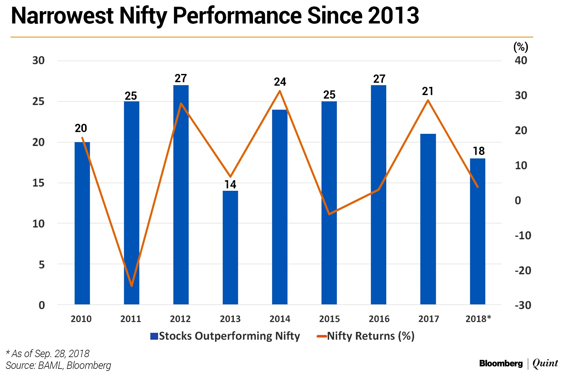 As the chart below suggests, the market performance was quite narrow in 2018. Only 18 out of the 51 Nifty stocks outperformed the index. We had a similar scenario in 2013 when macro worries dominated the market and individual stock picking took a backseat.