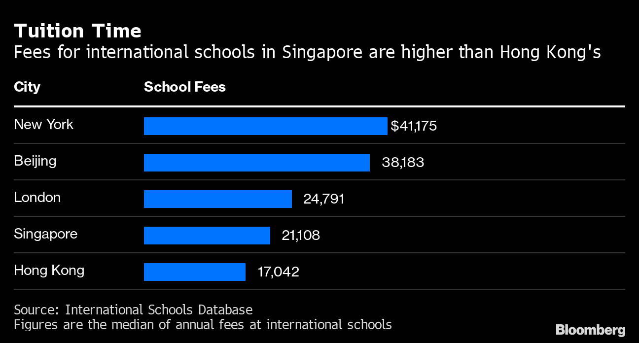 Median annual school fees at an international school in Singapore would have set you back about $21,000 last year, according to the International Schools Database. That's compared to about $17,000 in Hong Kong.