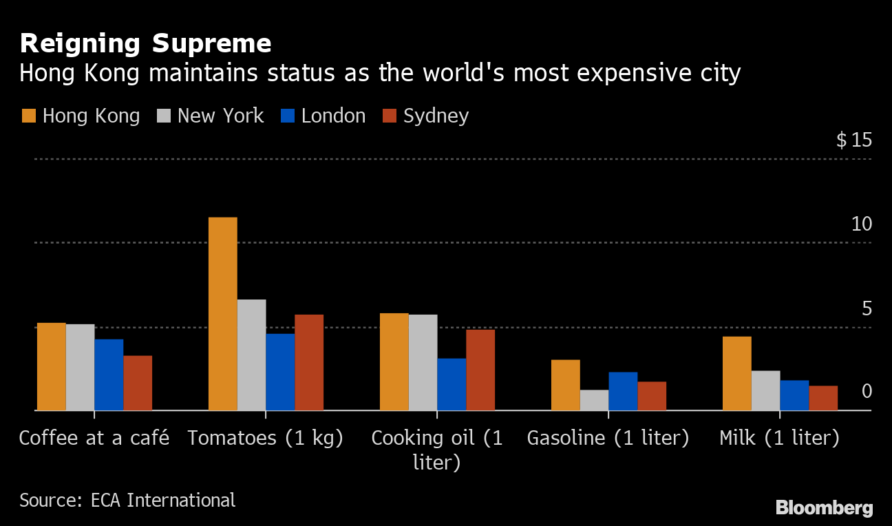 In Singapore, items such as utilities and gasoline got pricier this year but the weakening currency kept the city-state in 13th place on ECA's list, said Lee Quane, the firm's regional director for Asia. The Hong Kong dollar's peg to the greenback has helped curb inflation by maintaining the local currency's buying power.