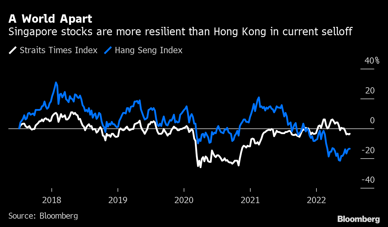 Singapore's benchmark stock index has been less volatile than Hong Kong's over the past five years, swinging between modest gains and losses except for during the March 2020 pandemic outbreak. The Straits Times Index is down about 4% since 2017, while Hong Kong's Hang Seng Index has tumbled almost 15% over the same period, including a drop of more than 6% in 2022.