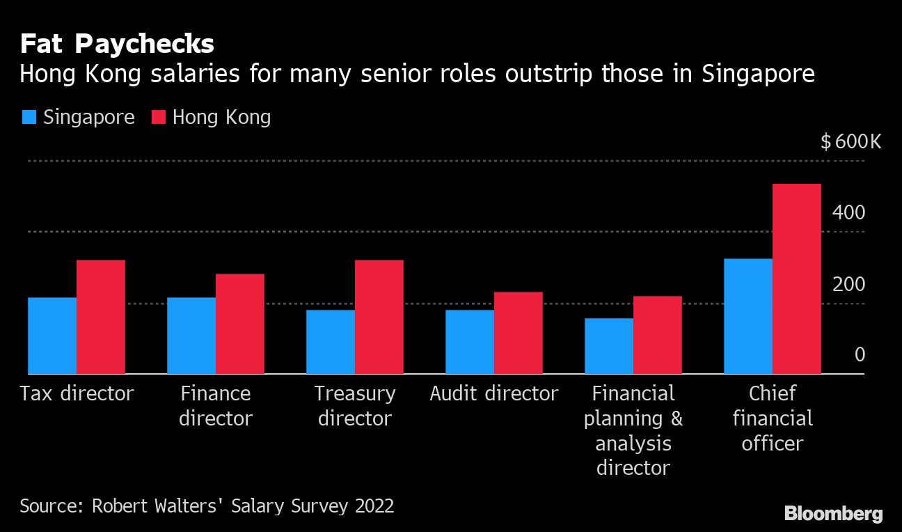 Wages for director- and chief officer-level positions are more than 60% higher in Hong Kong, according to data compiled by Bloomberg from a 2022 survey by recruitment firm Robert Walters Plc. In 2017, the difference was about 25%.