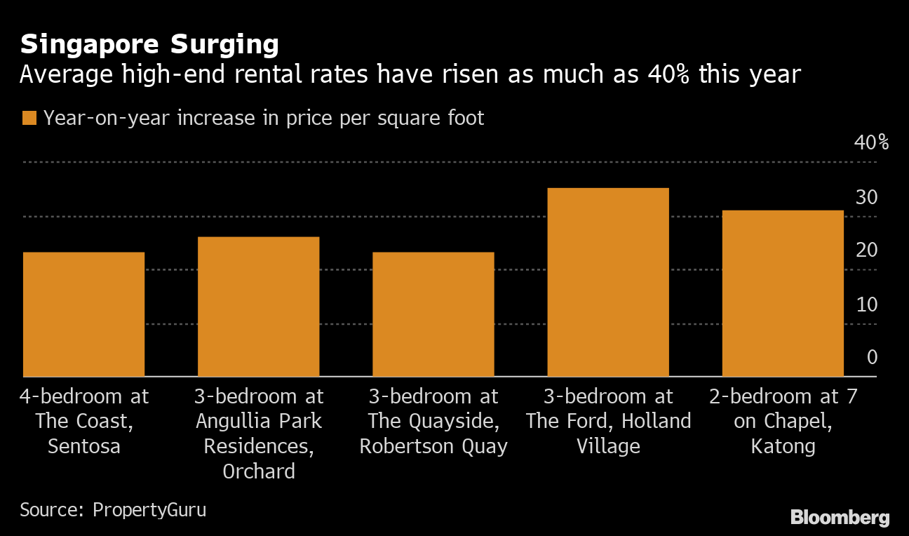 As Singapore re-opens and expats come flooding back, rental prices are catching up with notoriously costly Hong Kong — especially in the central business district. Pandemic-related delays in supply are having an impact too. Values are spiking for private homes, according to a report from property technology company PropertyGuru Group Ltd.