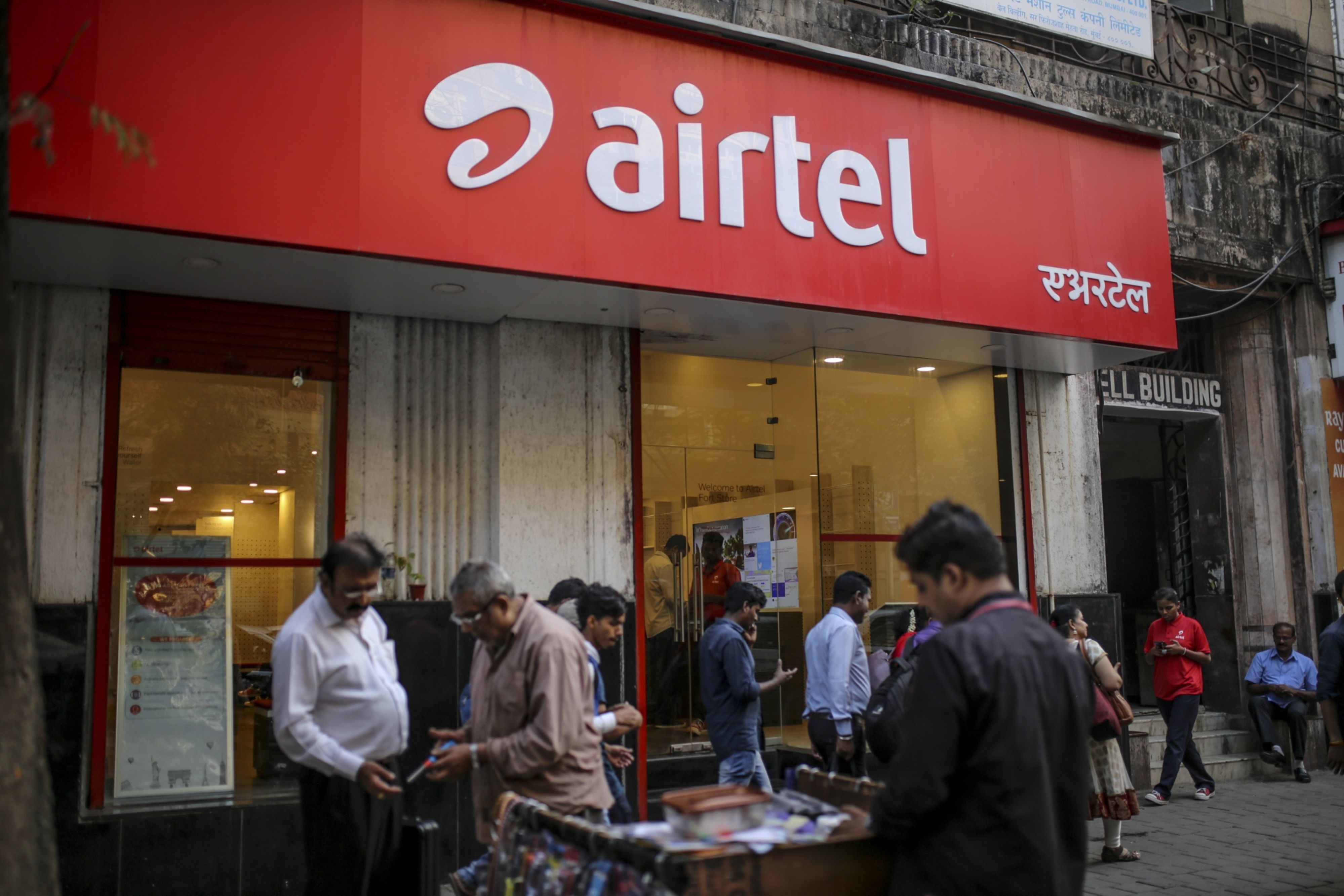 Pedestrians walk past a Bharti Airtel Ltd. store in Mumbai. (Photographer: Dhiraj Singh/Bloomberg)