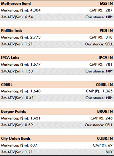 1) Motherson Sumi: This is a market leading franchise with Sumitomo's technology support in the wiring harness business complimented by a strong track record of inorganic growth.