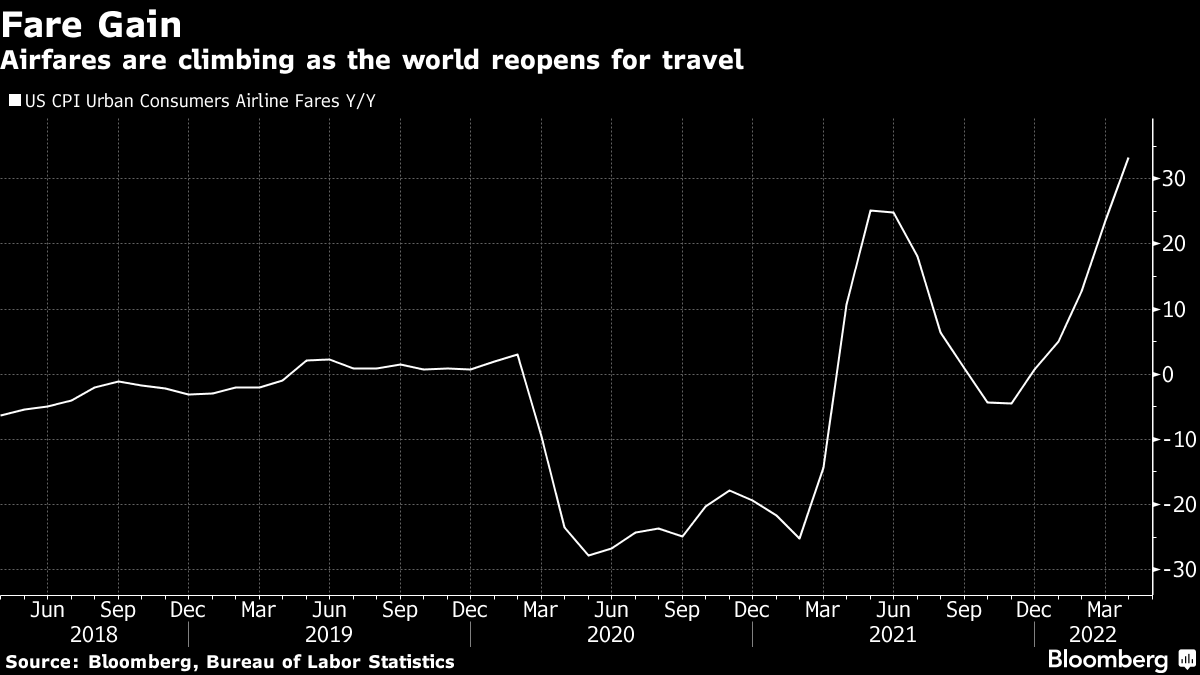 In a few cases, fares are actually lower than pre-pandemic levels, according to Michael O'Leary, chief executive officer of Ryanair Holdings Plc. While there's a prospect of more fares returning to levels they were at before Covid, the war in Ukraine and virus outbreaks are still risks, he said.