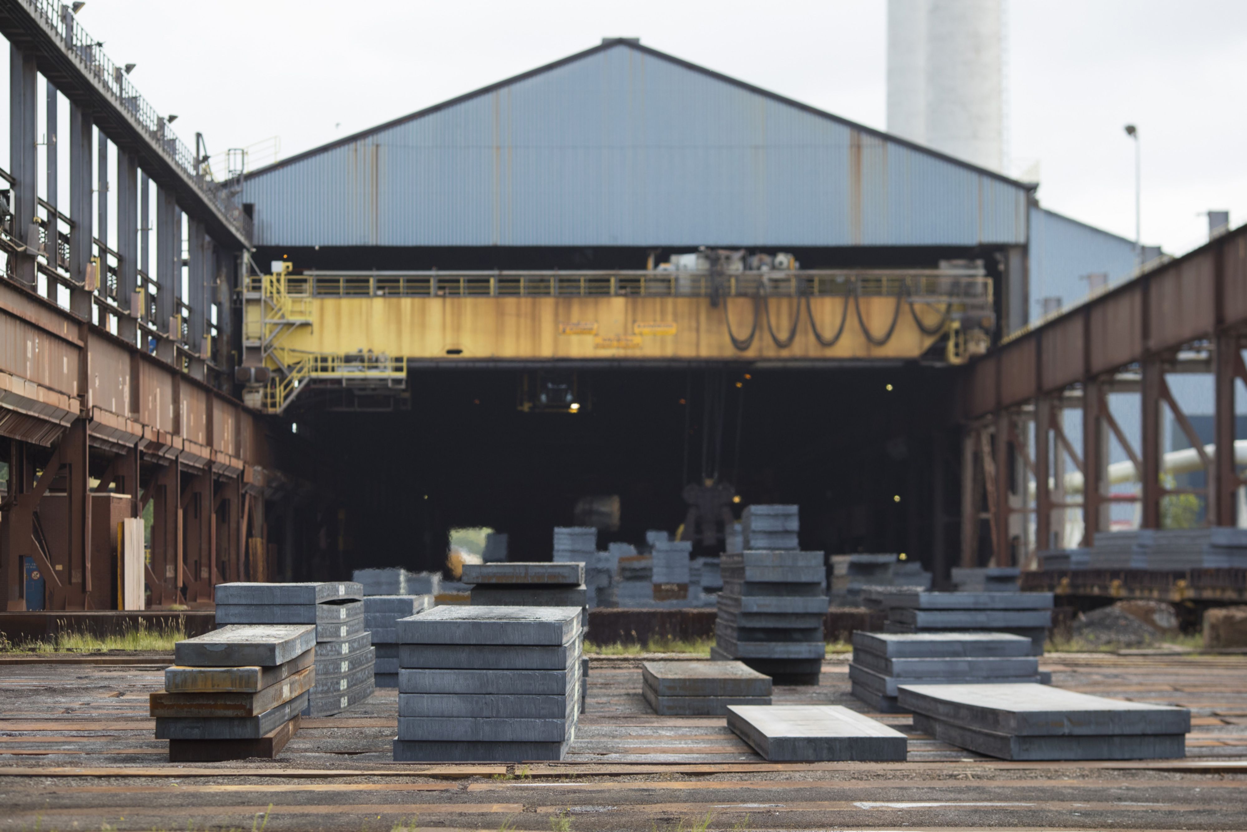 Slabs of steel sit in a storage area outside the Tata Steel Ijmuiden BV plant, a unit of Tata Steel Ltd., in Ijmuiden, Netherlands. (Photographer: Jasper Juinen/Bloomberg)