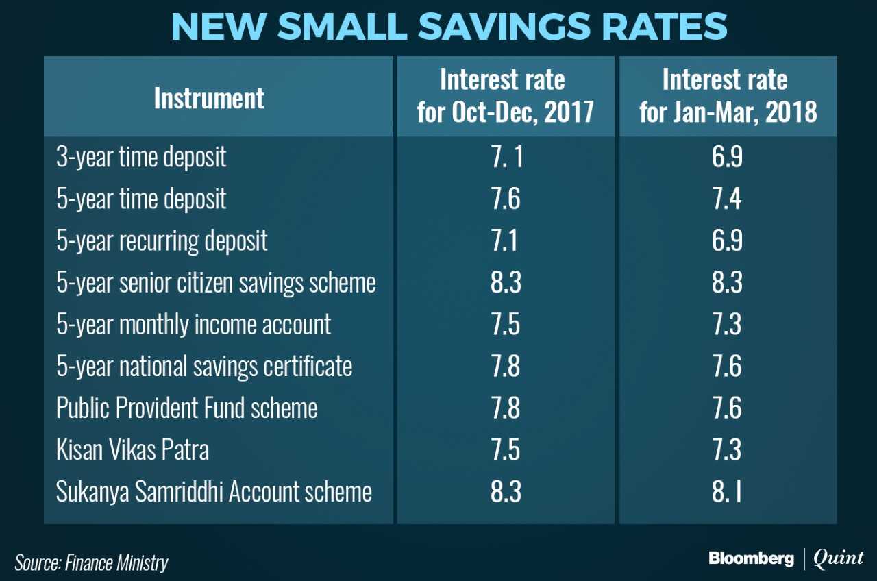 Interest rates on various small savings schemes like Public Provident Fund, Kisan Vikas Patra and National Savings Certificate have been reduced by 20 basis points for January-March 2018. The move could prompt banks to lower their deposit rates.