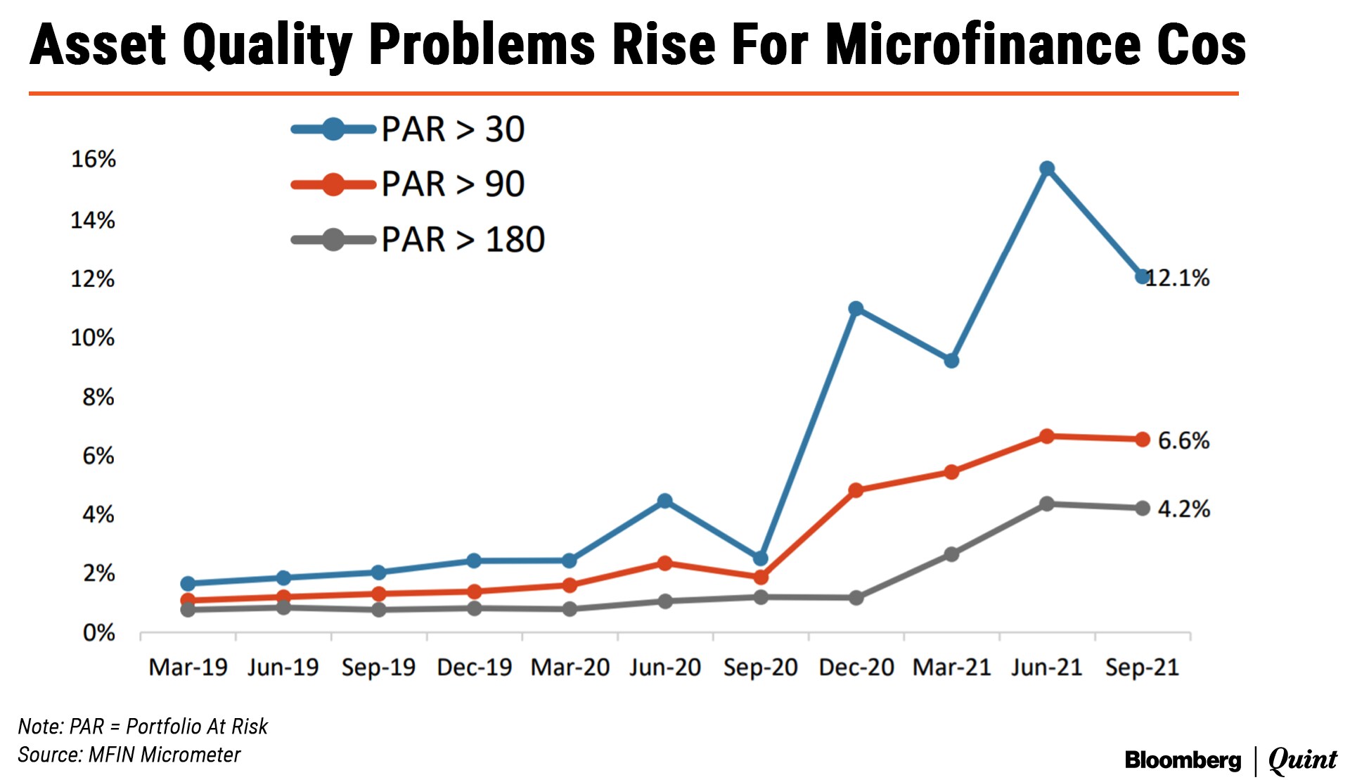 According to data released by Microfinance Institutions Network on Wednesday, in case of NBFC-MFIs, the portfolio in default for more than 30 days had risen to 12.1% as of Sept. 30, compared with 2.5% a year ago. The portfolio in default for over 90 days stood at 6.6% for this segment. MFIN reviews self-reported data from 55 NBFC-MFIs.