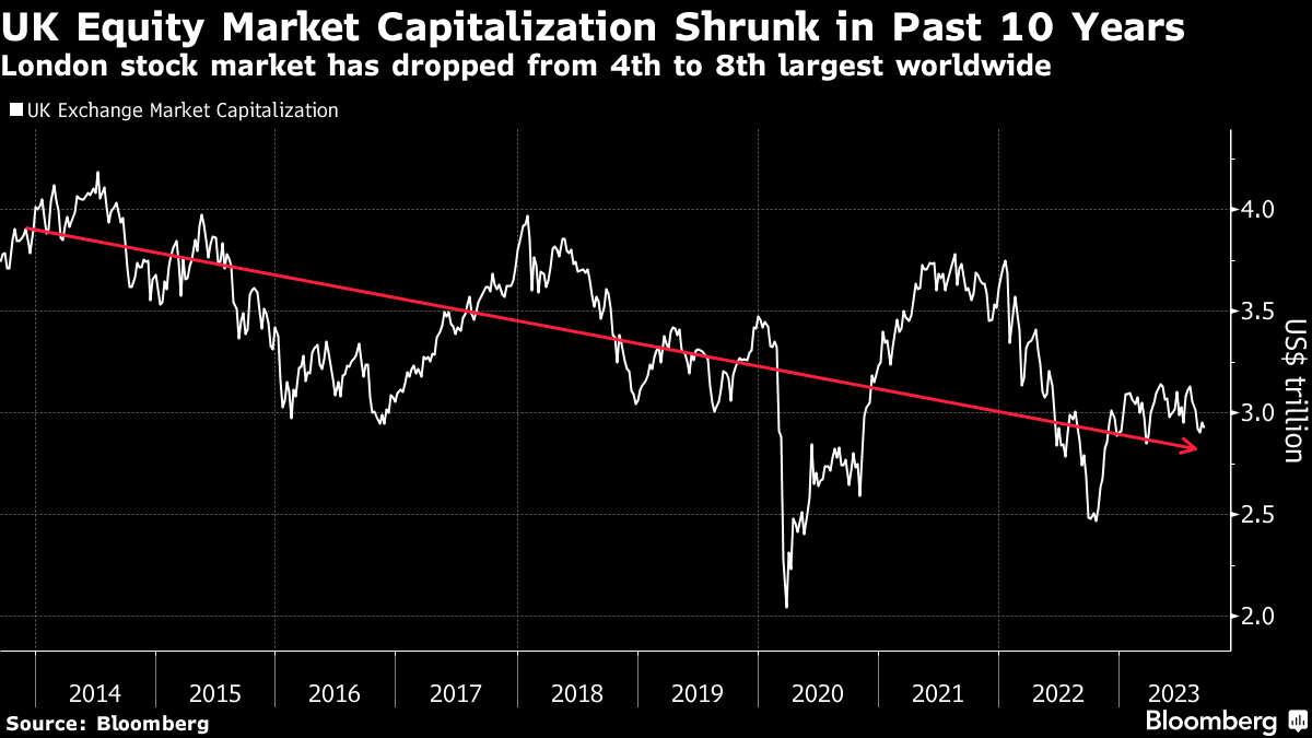 The low valuation of the UK stock market has hastened the exodus by encouraging foreign companies and private equity firms to buy and delist British companies. It's also pushing UK businesses to consider listing elsewhere in hopes of securing a richer value for their shares. And the UK's slumping economy has pushed investor dollars into other markets.