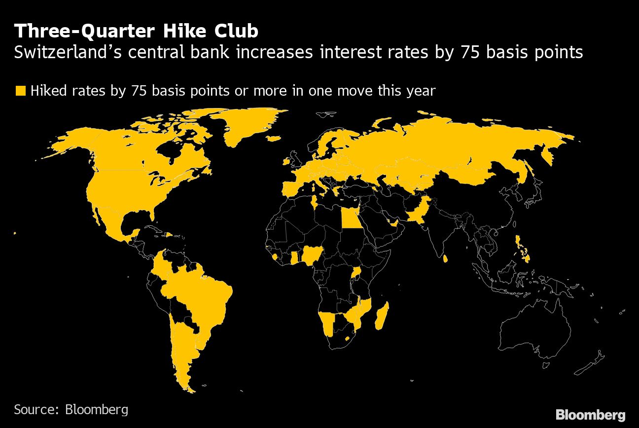The SNB hike is the second move by policy makers in Zurich to confront inflation in a year when about 90 counterparts have also raised rates. Around half of them have acted with at least 75 basis points in one shot, with the Federal Reserve delivering a third such step on Wednesday.