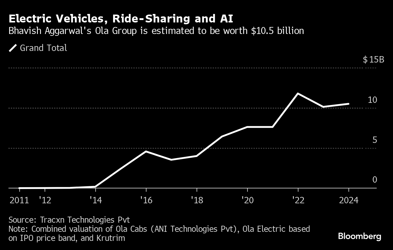 Aggarwal, 38, will add $1.2 billion to his wealth if his SoftBank Group Corp.-backed Ola Electric lists Friday in Mumbai at the lowest end of the price band at 72 rupees ($0.86) a share, giving the entrepreneur a net worth of $2.3 billion, according to the Bloomberg Billionaires Index. Ola Electric did not immediately respond to requests for comment on Aggarwal's net worth.