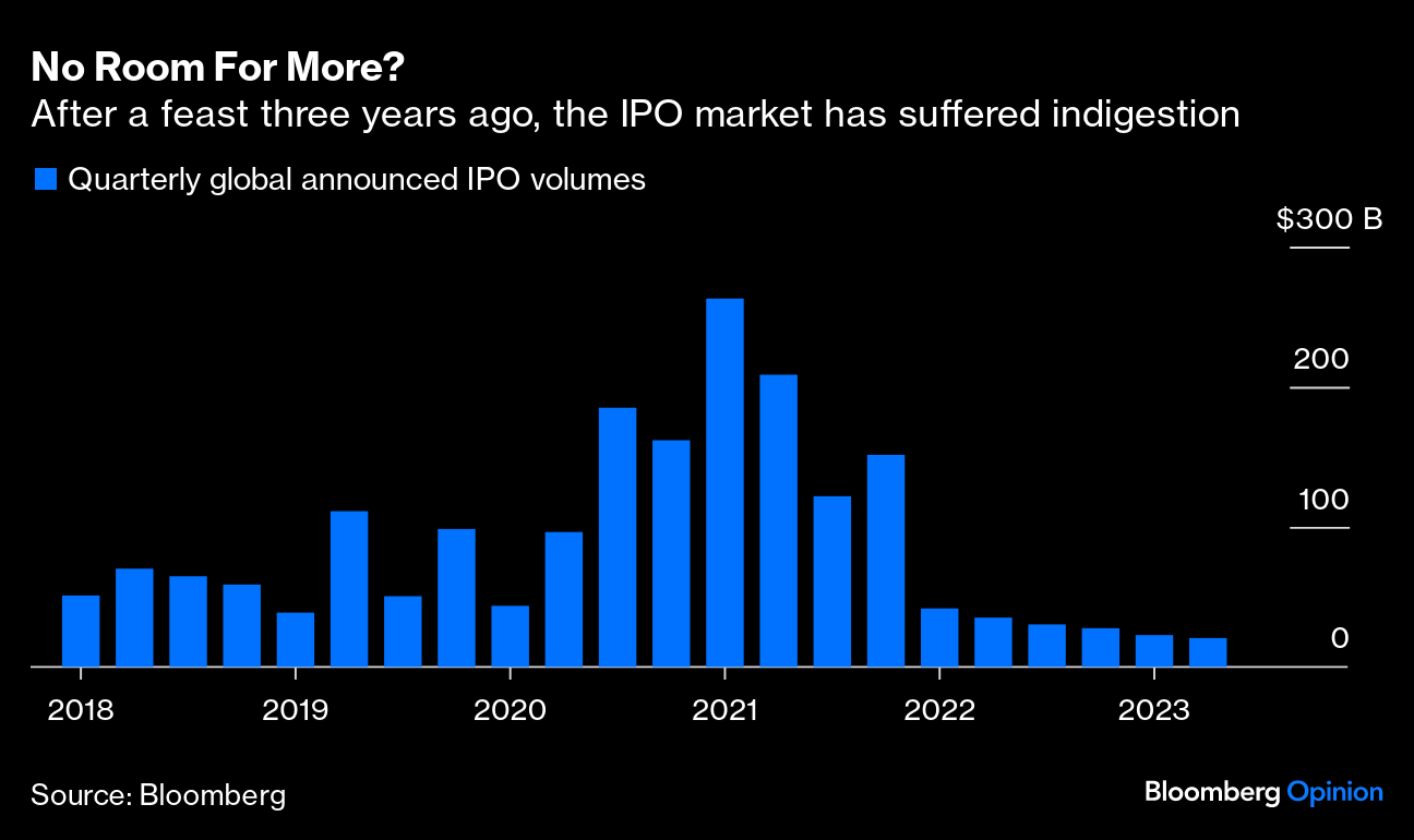 True, the backdrop is one of IPO activity picking up. Grocery delivery firm Instacart Inc. and high-class German shoemaker Birkenstock are preparing to go public in New York. Even so, this still feels like a buyer's market. Around two-thirds of the constituents of the S&P 500 and Stoxx Europe 600 indexes are down from the beginning of last year. Fund managers can snap up stocks they're familiar with at prices below their peak. They don't need to take a risk on an IPO.