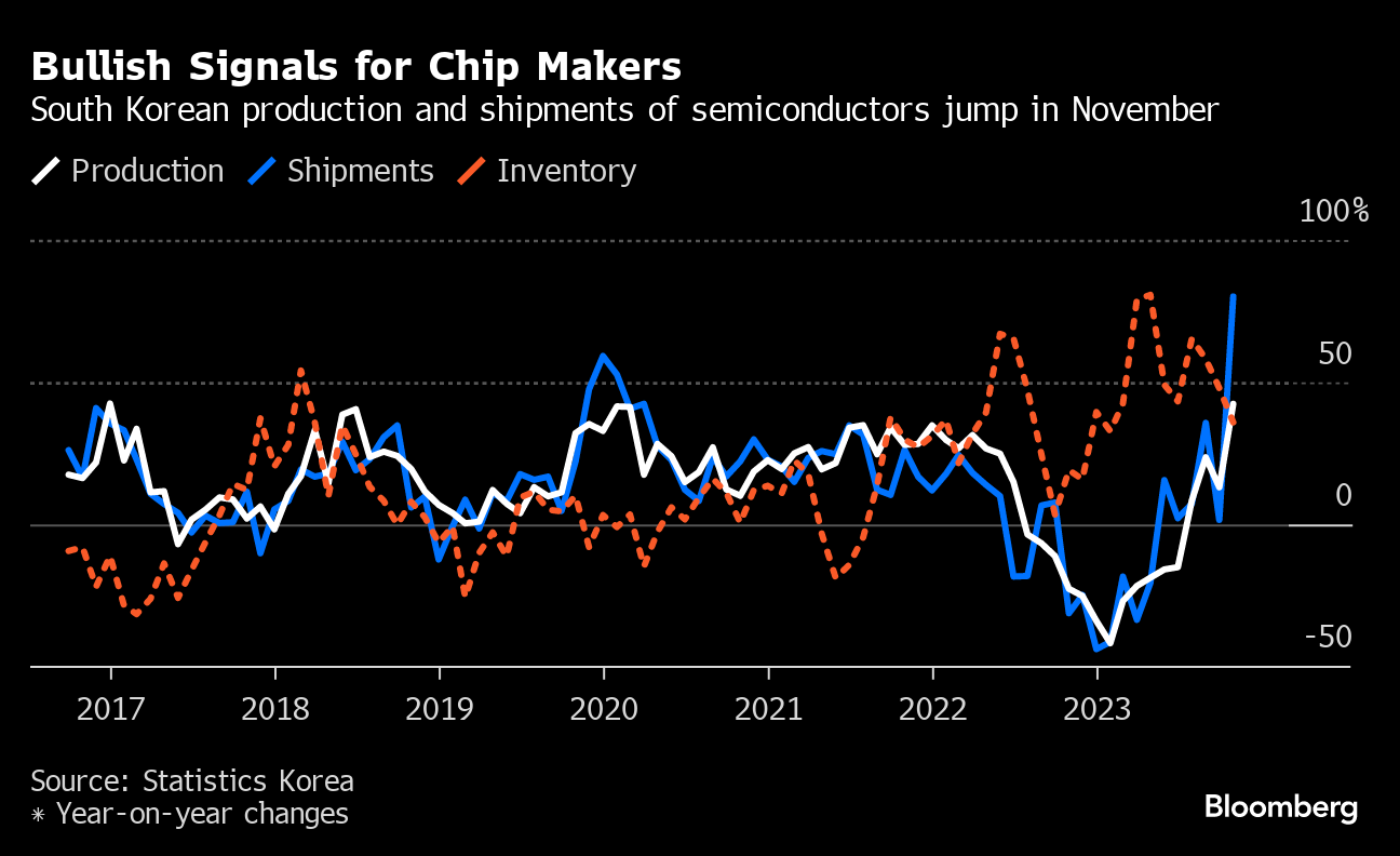 (Bloomberg) -- South Korea's semiconductor industry recorded the largest gains in years in both production and shipments, underscoring a revival of technology momentum that bodes well for the nation's economic outlook next year and for the global tech sector.