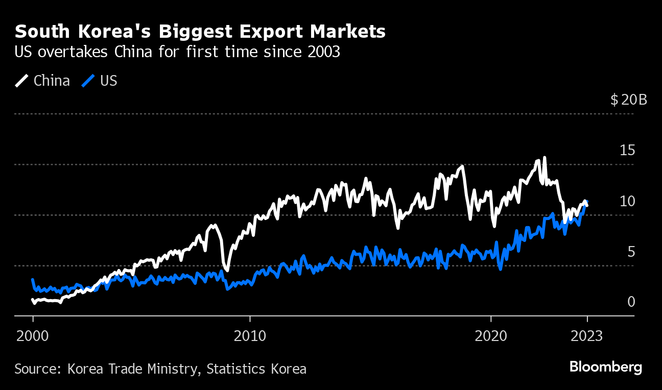 In a sign of closer ties with Washington and Beijing's economic challenges, South Korea sold $11.3 billion in goods to the US compared with $10.9 billion to China in December. Still, one month's data doesn't offer conclusive proof of an enduring shift in trading patterns.