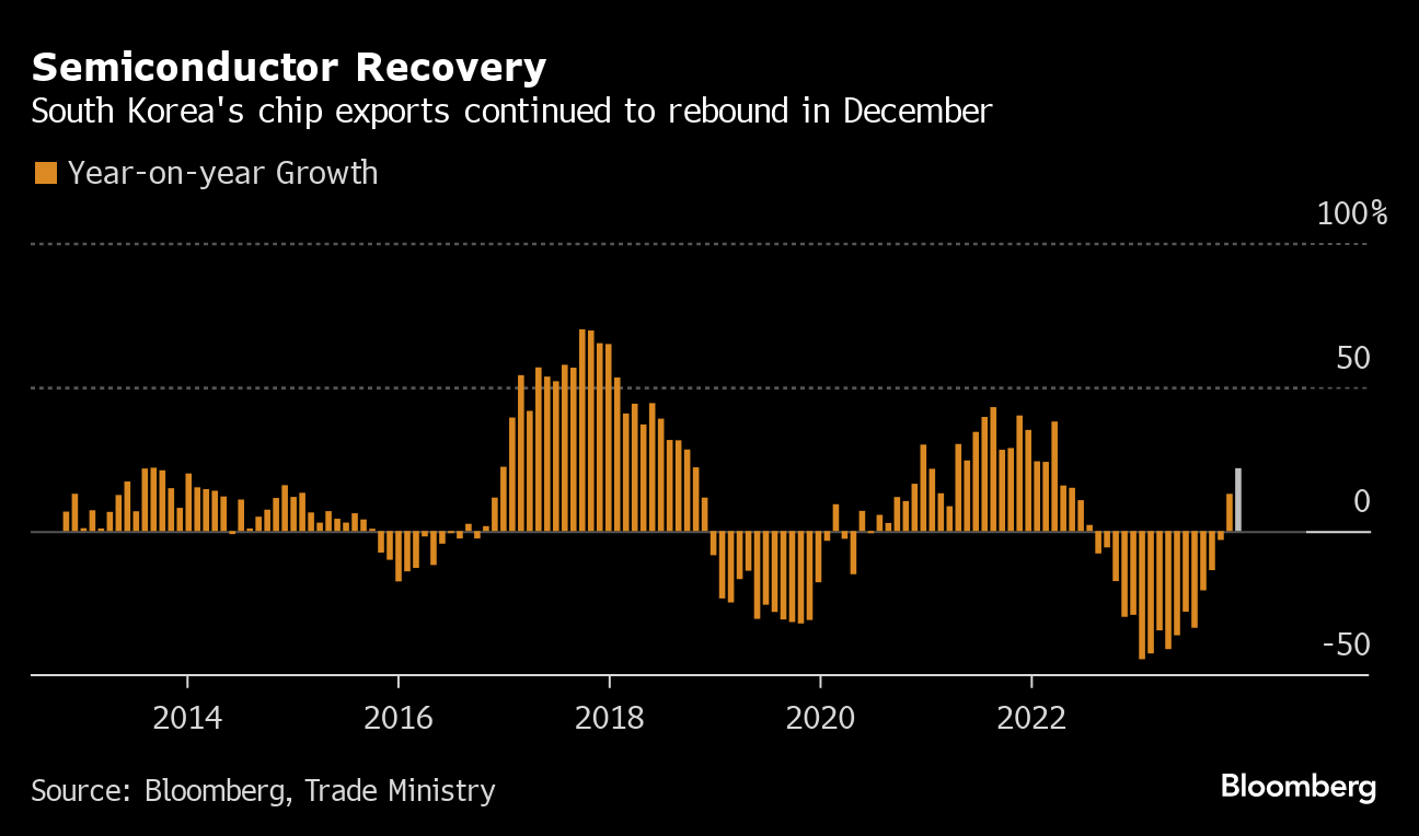 Semiconductor exports jumped 21.8% from a year earlier in December as memory-chip prices continued to rebound, the trade ministry said. Prices are rising again on the back of demand for artificial intelligence and other emerging technologies. The impact on economic growth in South Korea and countries including Taiwan and Vietnam will be closely watched in 2024.