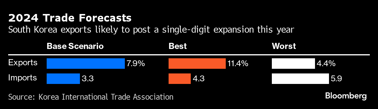 South Korea's exports will probably rise by 7.9% in 2024, reaching $680 billion, according to base-case forecasts by the Korea International Trade Association. The association expects imports to increase 3.3%, with the trade surplus reaching $14 billion.