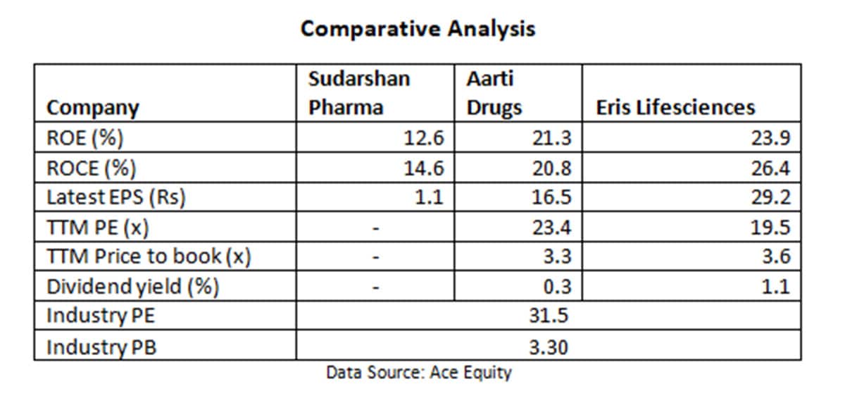 Sudarshan Pharma has a contract manufacturing facility for generic formulations. It is engaged in import & export activities, and supply of specialty chemicals, Pharma API, and intermediates.
