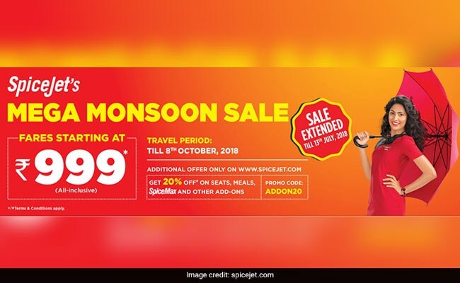SpiceJet's 'Mega Monsoon sale' has been extended till July 13, 2018, said the carrier on its official website- spicejet.com. Under this promotional sale, the airline is offering direct domestic flight tickets at a starting all-inclusive fare of Rs. 999. The travel period of the offer ends on October 8, 2018. The carrier is also offering 20 per cent discount on seats, meals, SpiceMax and other add-ons on booking via airline's official website. The promo code for the additional discount offer is ADD0N20.