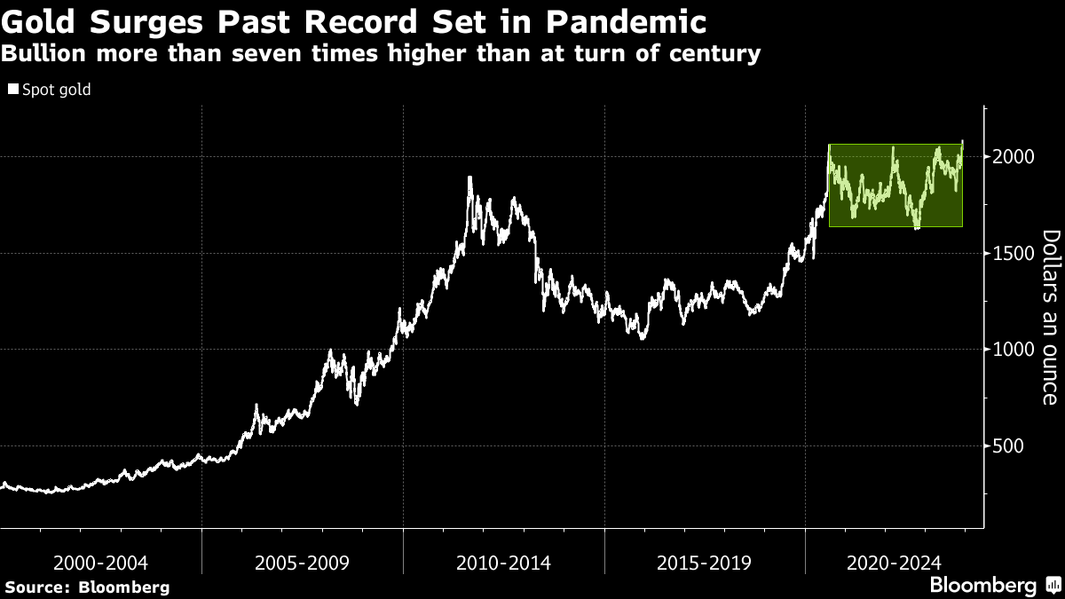 (Bloomberg) -- Gold shot past a previous all-time high set in the midst of the pandemic on growing expectations for US rate cuts early next year, despite attempts by the Federal Reserve to temper the optimism.