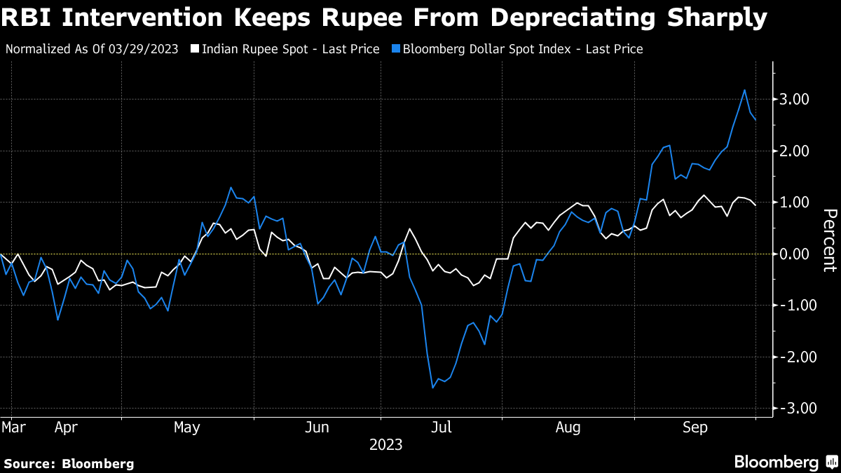 While the rupee has fallen 0.4% against the dollar so far this year, it is still one of the best-performing currencies in emerging Asia. It traded at 83.08 at 1:10 p.m. in Mumbai. India's forex reserves currently stand at about $593 billion, down from about $609 billion in July.