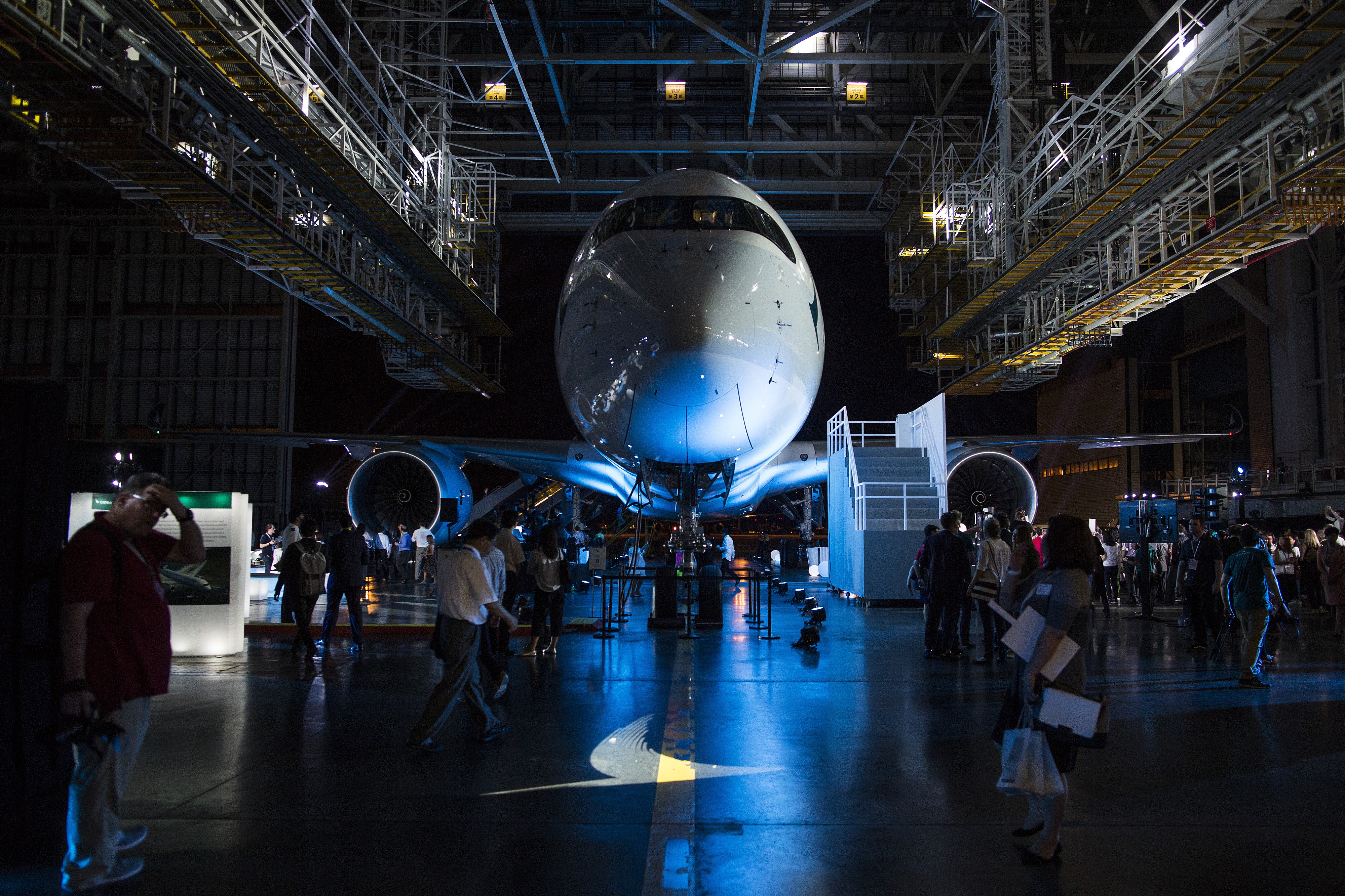 An Airbus Group SE A350-900 aircraft operated by Cathay Pacific Airways Ltd. stands during a launch ceremony in Hong Kong, China. (Photographer: Justin Chin/Bloomberg)