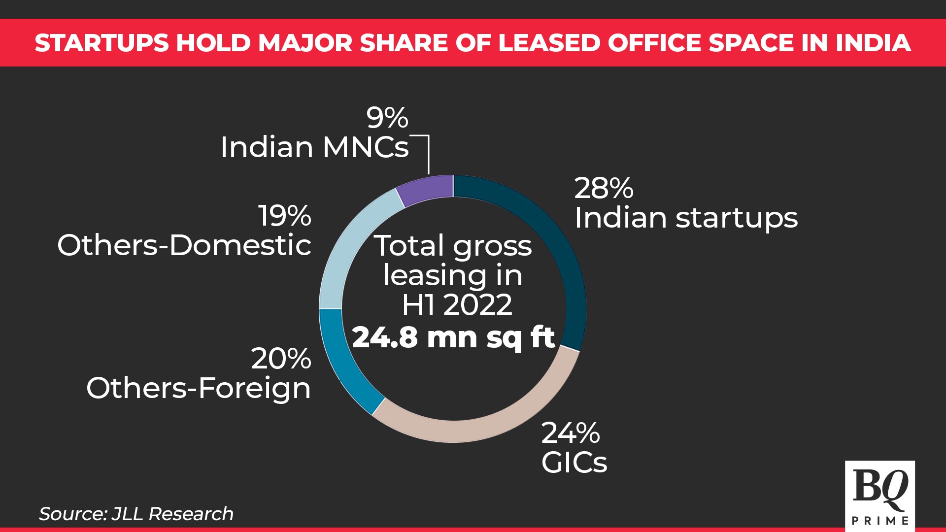 "The rising number of startups has also resulted in an upward spike when it comes to their real estate needs. In the first half of 2022, Indian startups leased 28% of the 24.8 million sq ft of office space leased to companies," it said.