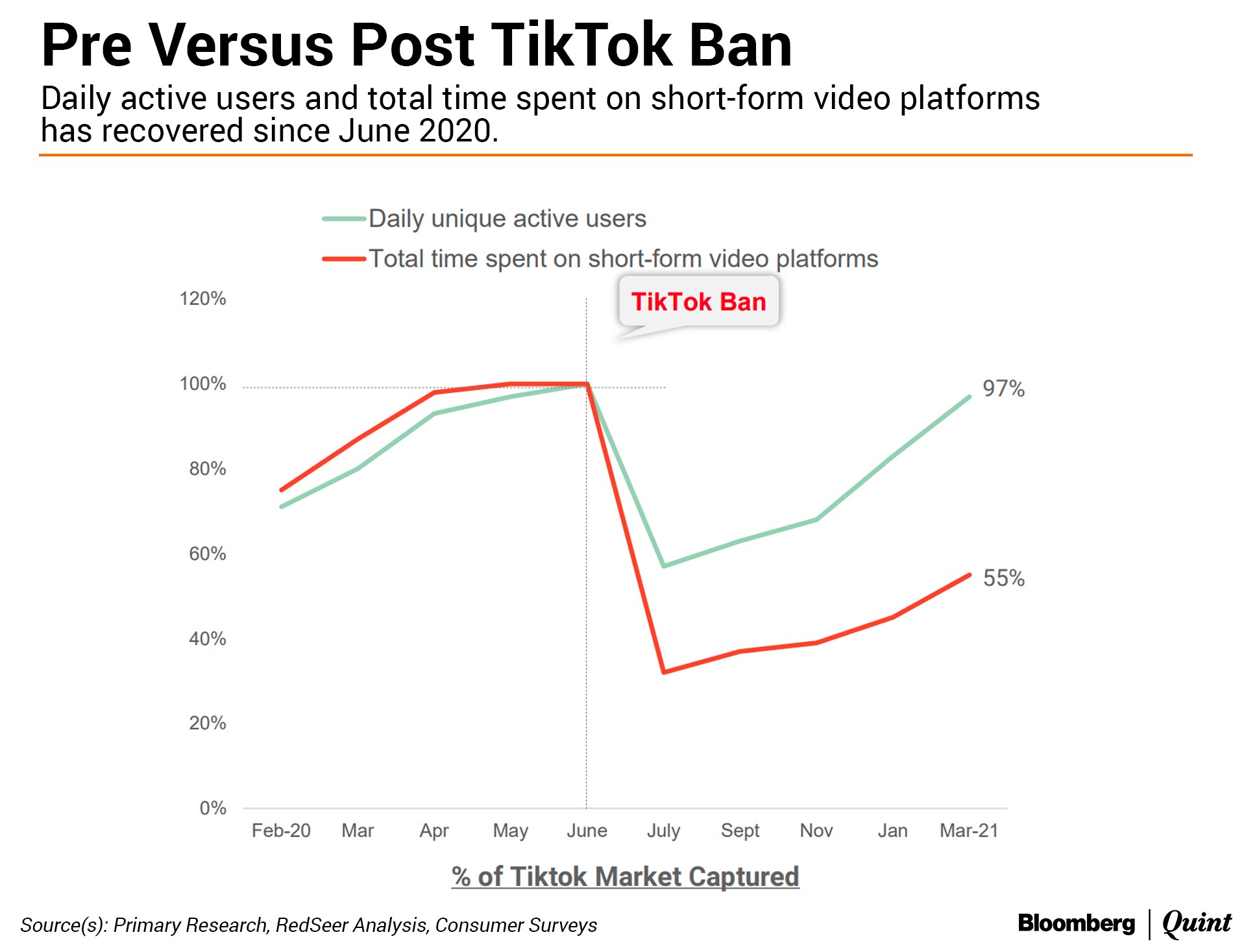 “In less than one year post Tik Tok ban, Indian platforms have shown a strong V-shaped recovery,” said Ujjwal Chaudhry, an associate partner at RedSeer Consulting. “This shows how platforms were able to design the product, execute their plans and market it aggressively in a very short period of time.”