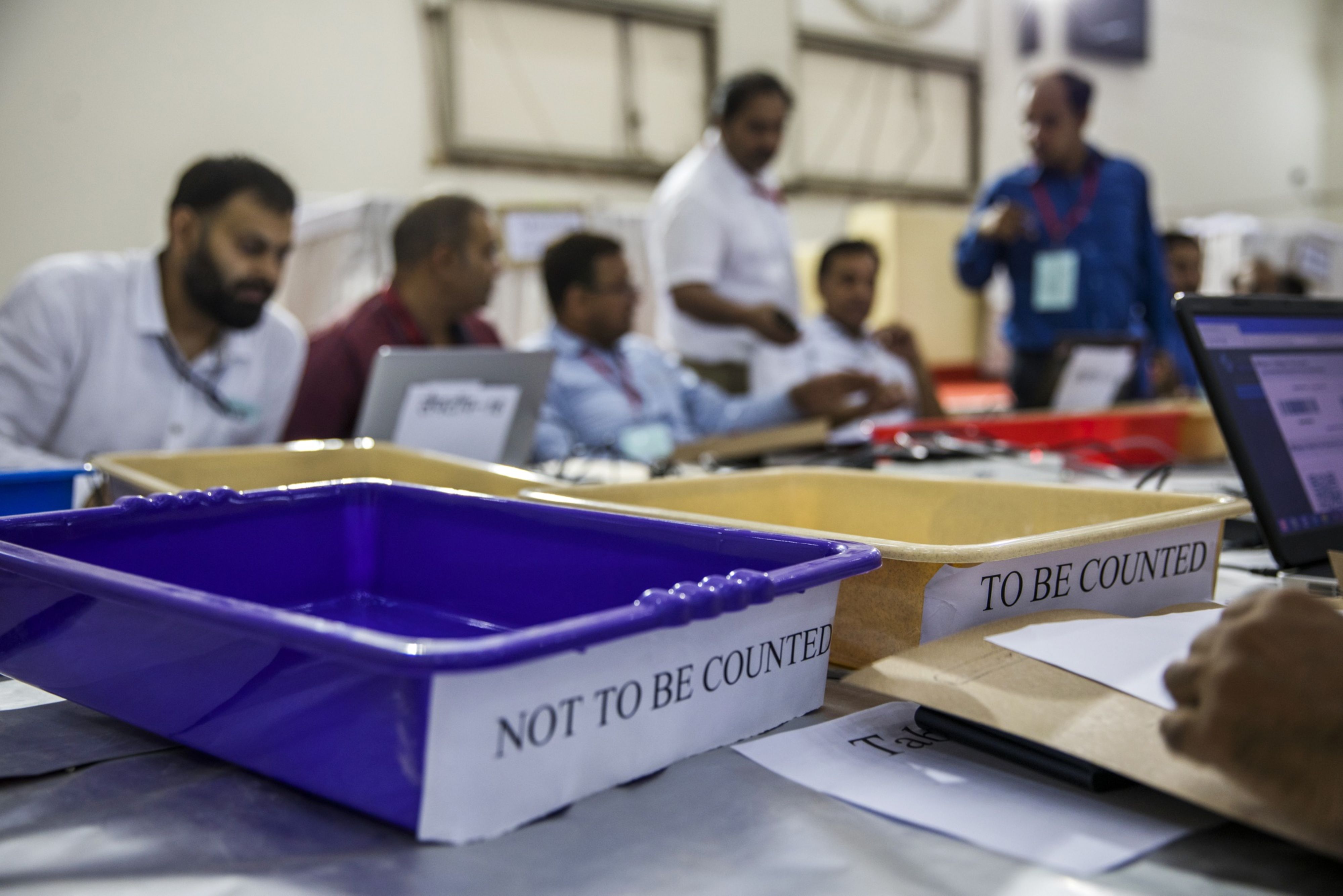 Trays sit ahead of the arrival of postal votes at a counting center for the general election in the Gautam Budh Nagar district of Noida, Uttar Pradesh, India, on Thursday, May 23, 2019. Photographer: Prashanth Vishwanathan/Bloomberg