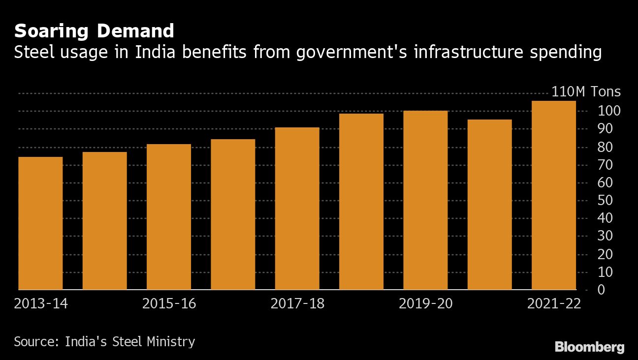 India's demand for steel is set to outpace the rest of the world, supported by government capital expenditure that will increase by more than a third in the year through March 2023, with hefty increases for rail and roads, according to Bloomberg Intelligence. Consumption is likely to rise even more as prices cool after the country imposed a tax on steel exports and scrapped import duties on key input materials to tackle surging prices and rein in inflation.