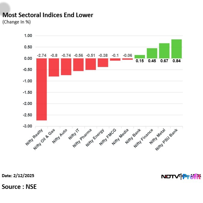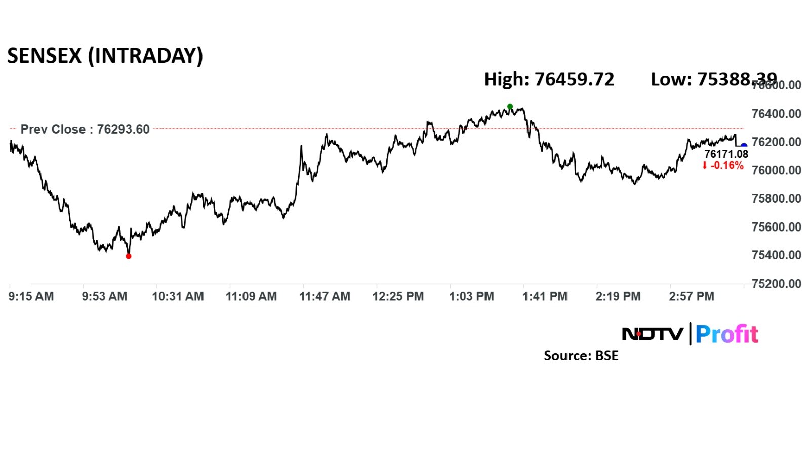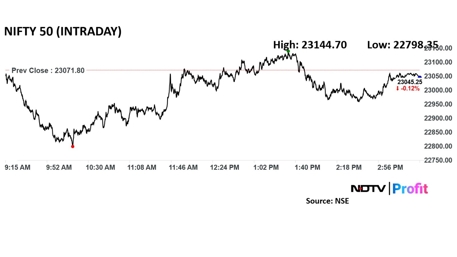 The NSE Nifty 50 ended 26.55 points, or 0.12% lower at 23,045.25, and the 30-stock BSE Sensex ended 122.52 points, or 0.16% down at 76,249.54.