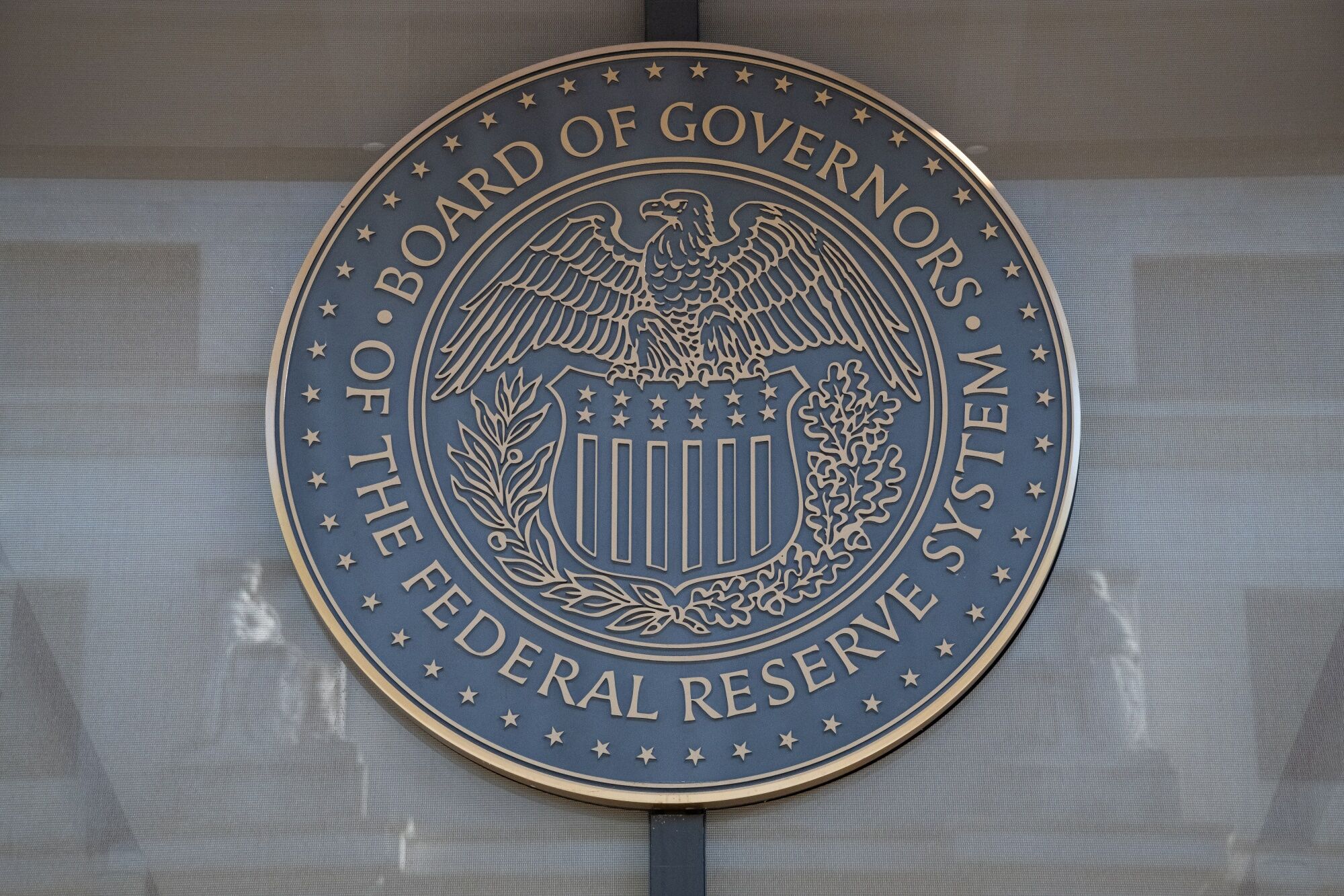 The seal of the US Federal Reserve Board of Governors near the Marriner S. Eccles Federal Reserve building in Washington, D.C., US, on Tuesday, Aug. 23, 2022. The Federal Reserve chair's speech this week at the Jackson Hole symposium is expected to offer clues on the Fed's tightening path, with hedge funds making record bets that the US central bank will stick to its hawkish script. Photographer: Graeme Sloan/Bloomberg