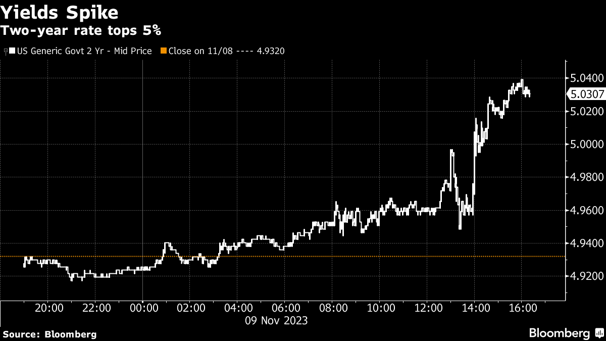 The S&P 500 halted what would have been its longest advance since 2004, while two-year rates topped 5%. A weak sale of 30-year notes also weighed on sentiment, raising concern about the market's ability to absorb new debt. Powell's comments also made traders price in slightly higher odds of an additional Fed hike, while paring bets on a rate cut happening before July.