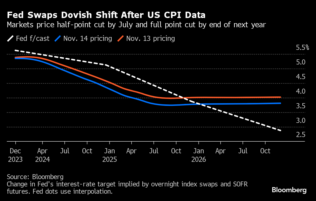 The consumer-price index also added to the “Goldilocks narrative,” with the economy remaining resilient and disinflation allowing the central bank to ease policy in 2024. Fed swaps indicate the odds of another hike in the current tightening cycle have fallen to almost zero — with the market now pricing in a 50 basis-point rate cut by July from the current level of 5.25-5.5%.