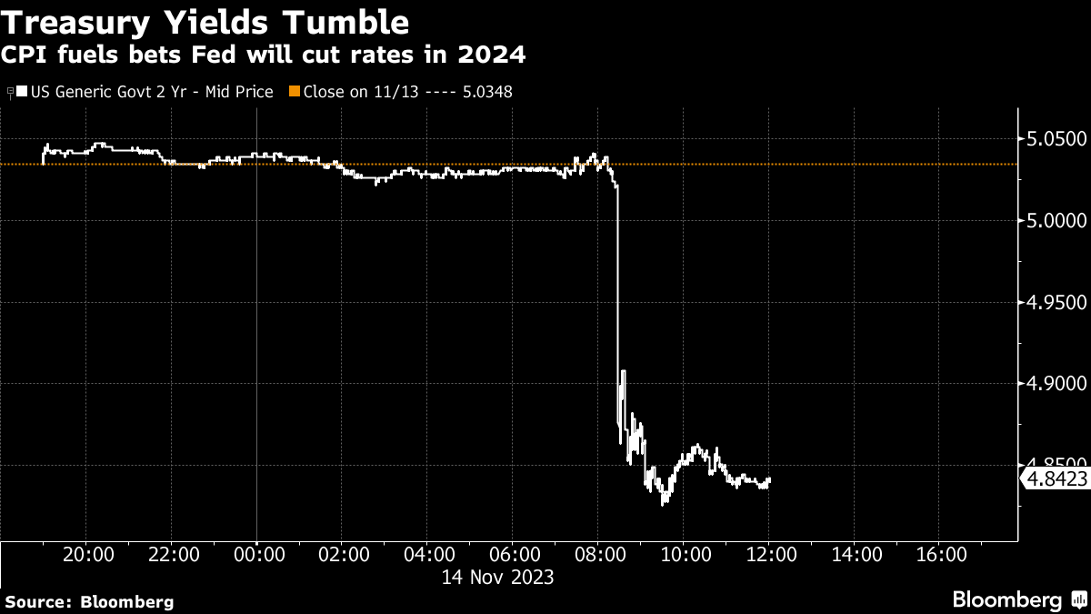 (Bloomberg) -- Stocks climbed while bond yields sank as an unexpected inflation slowdown bolstered bets the Federal Reserve's aggressive hiking cycle is now over — and the next move will be a cut in mid-2024.